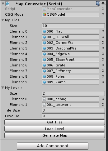 The magic happens in an Editor script I wrote which reads the CSV file and spawns the prefabs. It is attached to the CSGModel gameobject so the prefabs are spawned under it and become brushes. The only thing the script doesn’t do yet is clear out any existing prefabs, so if you want to make big changes, its easy enough to delete everything under the CSGModel object and generate the map again.