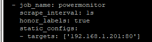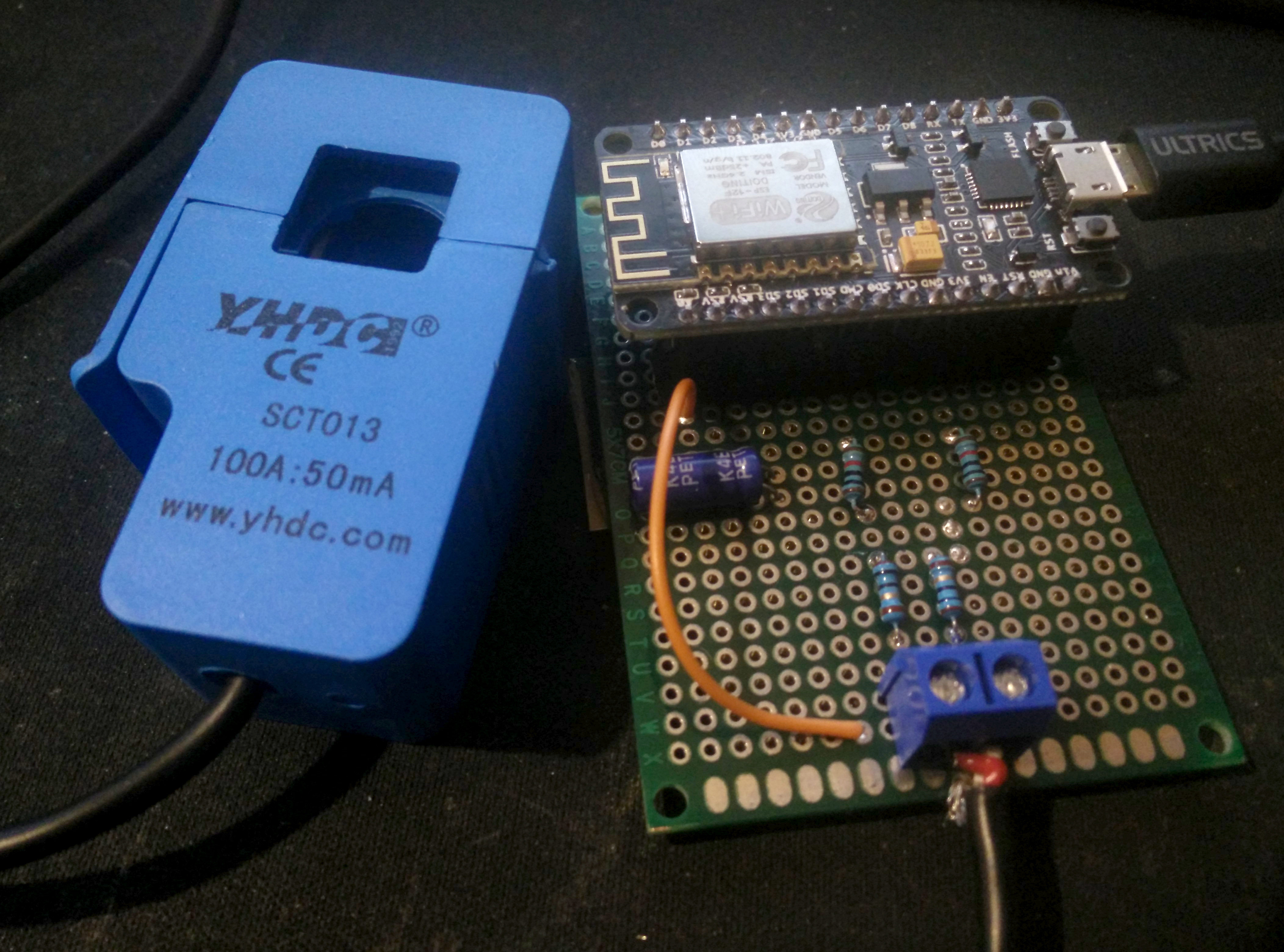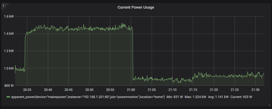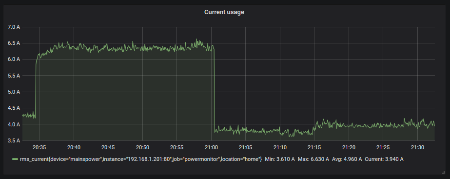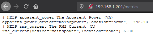 The general idea is using the EmonLib package to pull the current sensor values and the ESP8266 example HTTP server I publish the current and power stats to the HTTP server in a format which Prometheus can scrape.
